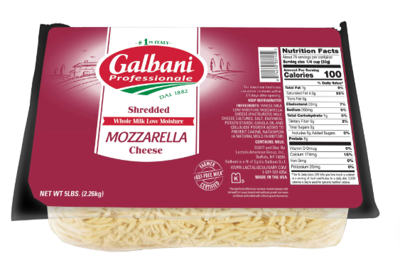 Mozzarella Cheese; Shredded; Low Moisture; Whole Milk, 5# Bag, Sorrento – Galbani Brand